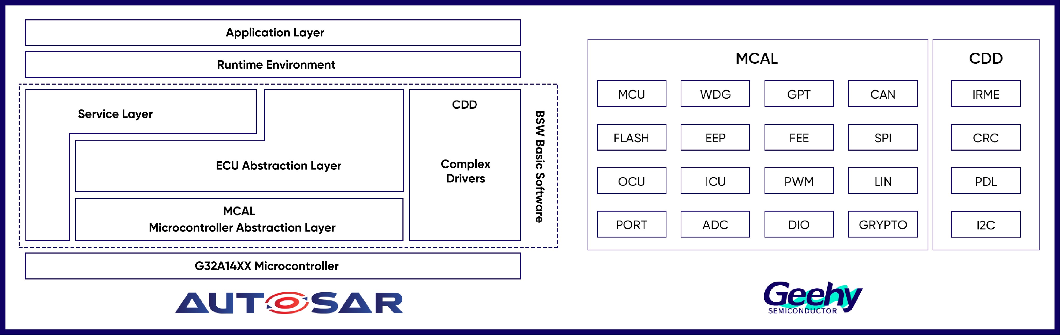 Geehy's self-developed G32A14xx AUTOSAR MCAL software package includes AUTOSAR standard modules as well as CDD-based extended modules. All modules are designed in strict accordance with AUTOSAR CP V4.3.1 MCAL SWS/SRS specifications and BSW General requirements. The delivered software has passed unit testing, integration testing, static code analysis, and dynamic configuration verification using mainstream third-party tools, ensuring high code quality and reliable delivery. The reference code meets domestic and international customer requirements for software safety, integrability, portability, and ease of use.