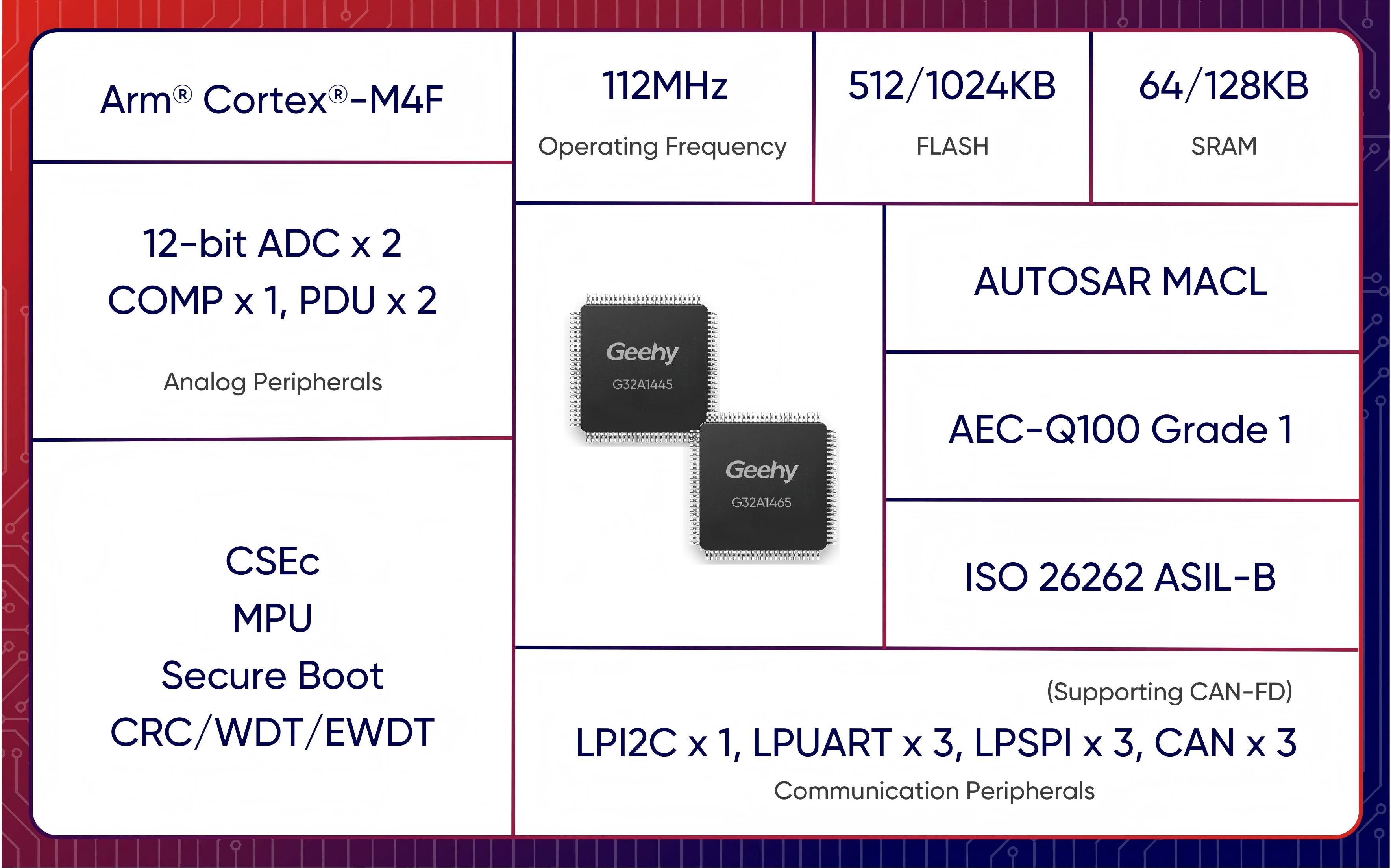 The Geehy G32A14xx automotive general-purpose MCU series is based on the Arm® Cortex®-M4F core and has obtained AEC-Q100 Grade 1 and ISO 26262 ASIL-B certifications. The series has completed module development and validation with more than 50 Tier-1 suppliers and is now in large-scale mass production. With strong portability and close coordination across product definition, iterative upgrades, and application validation, G32A14xx MCUs have been widely adopted in automotive applications, including BCM, BMU, charging stations, seat controllers, T-Box, OBC on-board chargers, and HVAC systems.