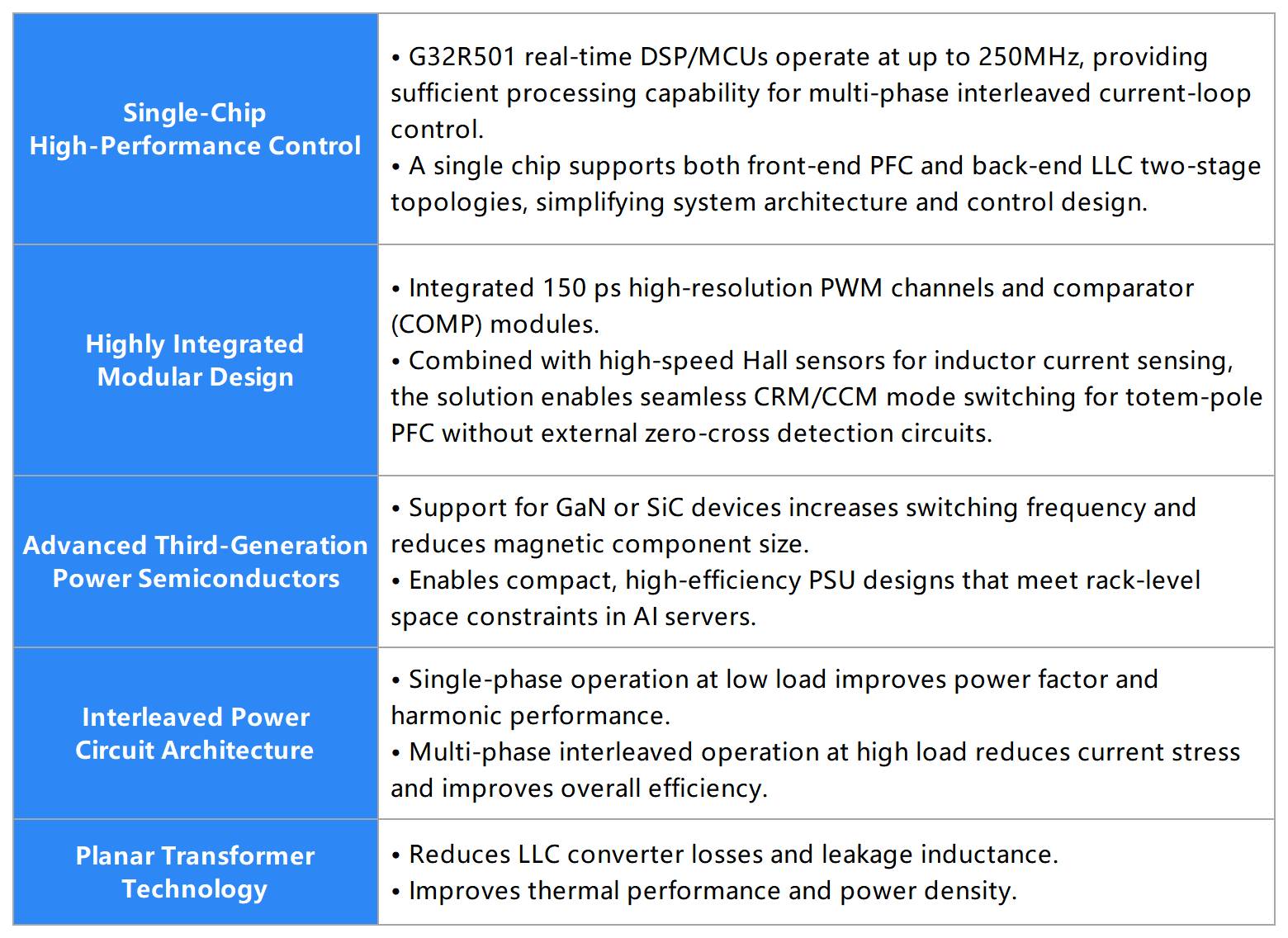 The G32R501 real-time DSP/MCUs support a two-stage power topology and meet the power requirements of 7kW–11 kW AI server power supplies.