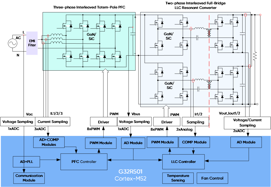 The Geehy G32R501 real-time DSP/MCUs deliver high computational performance, precise real-time control, and intelligent energy management, making it well-suited for AI server PSU applications. Using a single G32R501 device with a three-phase interleaved totem-pole PFC and LLC resonant converter topology, the solution achieves high efficiency and high power factor across the full load range. It provides strong technical support for improving efficiency and power density while helping power products meet the 80 PLUS® Ruby standard.