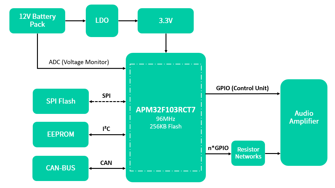 l Based on Arm® Cortex®-M3 core with 96MHz main frequency, the AVAS system can process CAN message in time and reduce the frame loss caused by poor processing efficiency.