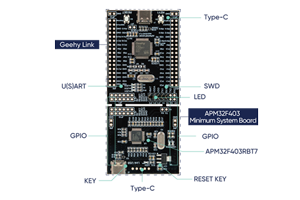 The APM32F403R Micro-EVB is a compact development platform for APM32F403xB basic extended MCUs. It features an APM32F403RBT7 MCU with a 120 MHz Arm® Cortex®-M4F core and 128 KB Flash. The board integrates a Geehy-LINK module and a minimal system, supporting debugging via onboard LINK or direct Type-C connection. It provides accessible I/O pins, buttons, UART, and basic peripherals for quick simulation and programming.