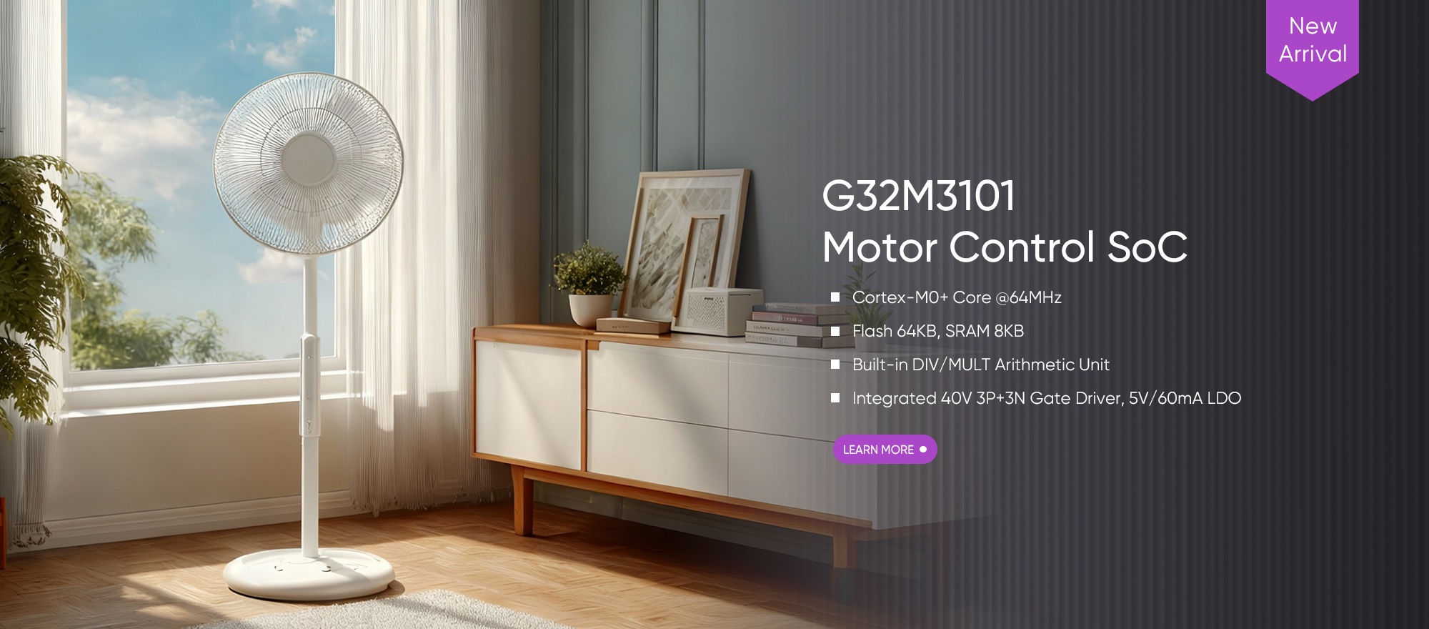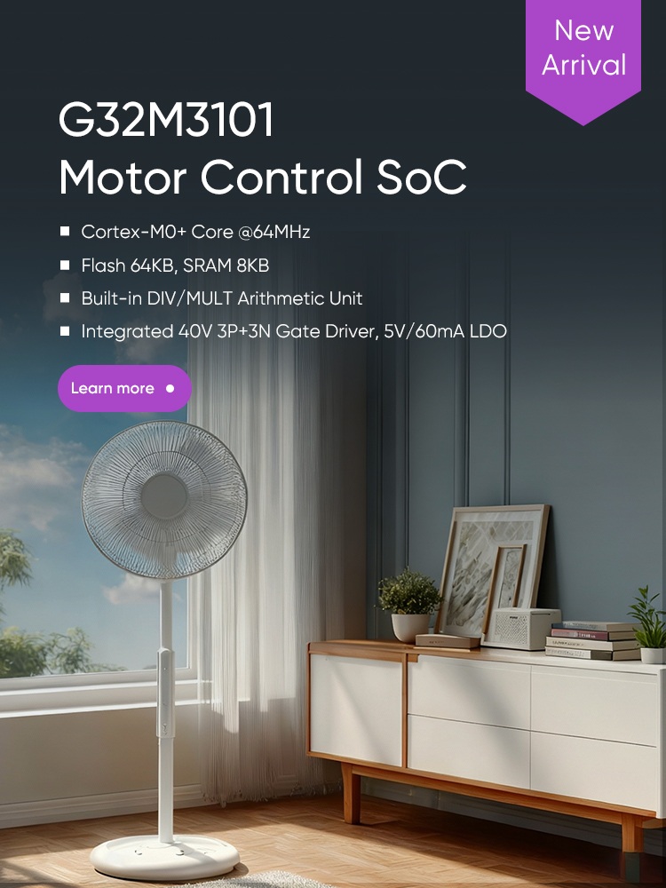 The G32M3101 Motor Control SoC is built on a 64 MHz Arm® Cortex®-M0+ core and integrates a 40V 3P+3N gate driver and a 5V/60mA LDO. Its DIV/MULT arithmetic unit accelerates algorithm processing, and its rich peripheral set makes it ideal for applications like fans, water pumps, air purifiers, pedestal fans, and personal care devices.