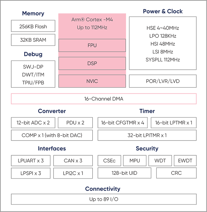 Arm® Cortex®-M4F - Operating frequency: 112MHz