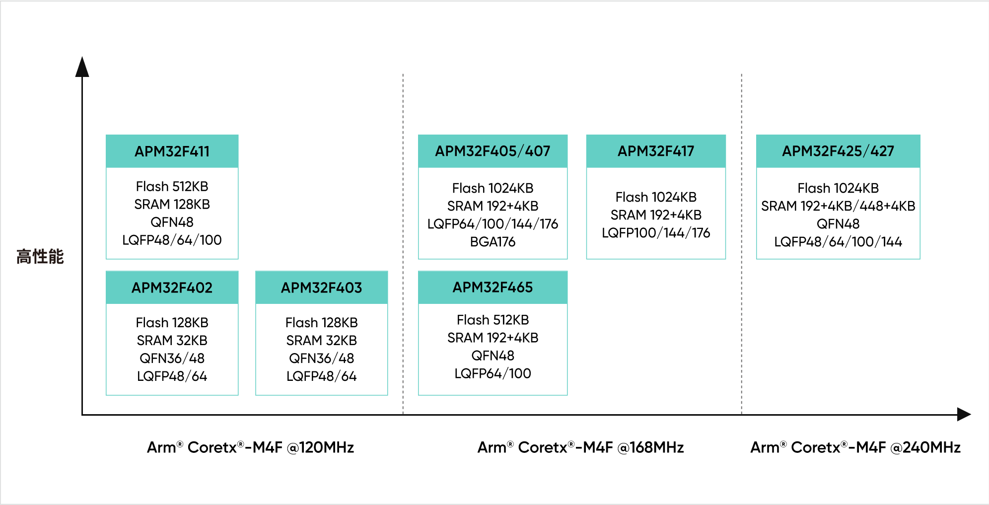 查看所有产品基于Arm® Cortex®-M4F内核,工作主频高达168MHz,具有强大运算处理性能,超大存储空间,以及增强型安全防御,适合对芯片性能有较高要求的中高端市场应用。其中APM32F407系列MCU,已通过IEC 60730功能安全认证。