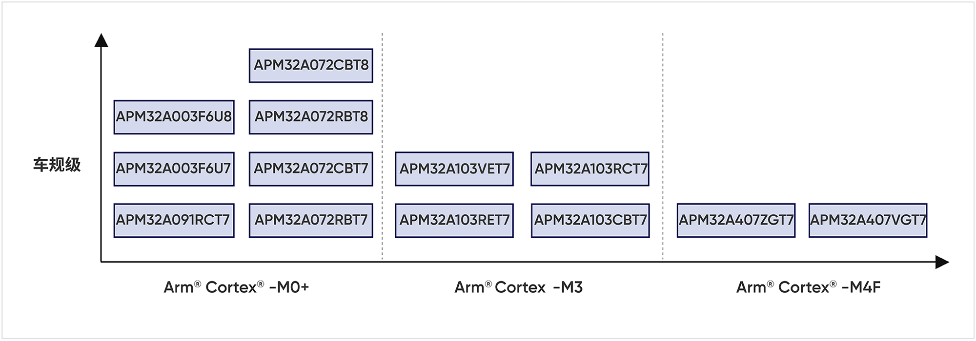 APM32A系列车规级MCU,覆盖Arm® Cortex®-M0+/M3/M4F内核,拥有APM32A407系列、APM32A103系列、APM32A091系列三大产品线,共计6款产品,具有高效CPU处理性能、增强型存储空间,以及丰富连接功能,通过AEC-Q100 车规可靠性认证和ISO 26262功能安全管理体系认证,进一步拓展极海车规级MCU产品阵容,符合车用芯片高可靠性、高工作温度范围等要求,有效满足汽车电子多样化通信与车身控制应用开发需求,可广泛应用于车身控制、安全系统、信息娱乐系统、动力系统等车用场景。